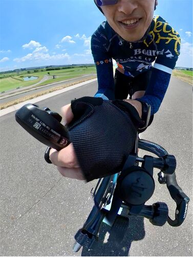 左エアロバーのグリップに360°カメラをマウントしています 握りにくいので右エアロバーだけ握って走ってみたら意外といい感じ 両腕が狭くなるのでエアロ効果が高まるし それほど操舵性も悪くありません 画像では右手が下になっていますが暫く走ると左手を下…